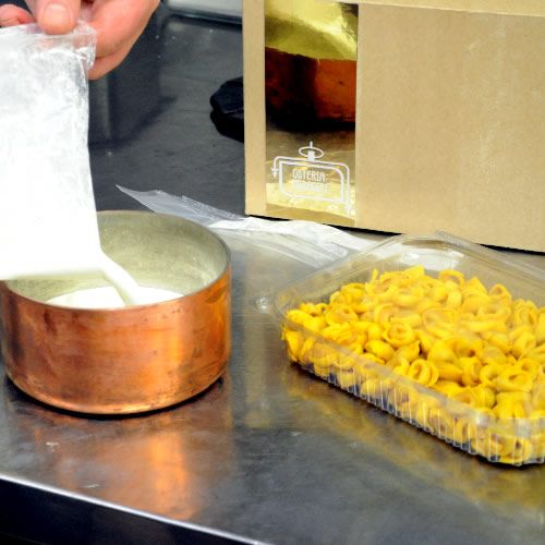 TORTELLINI MIT OBERFLÄCHENSAHNE: Aus den Familiengeschichten geht hervor, dass ein Teil des Gehalts für die Arbeit in der Molkerei Milch, Käse, Butter, Ricotta und Oberflächensahne umfasste - die letztere war die Sahne, die in der Milch zur Oberfläche kam, die am Vorabend gemolken und die bis zum nächsten Morgen ruhen gelassen wurde, bevor sie für die Herstellung von Parmigiano Reggiano genutzt war und die daher ein Synonym für hohe Qualität und Authentizität des Produkts war.