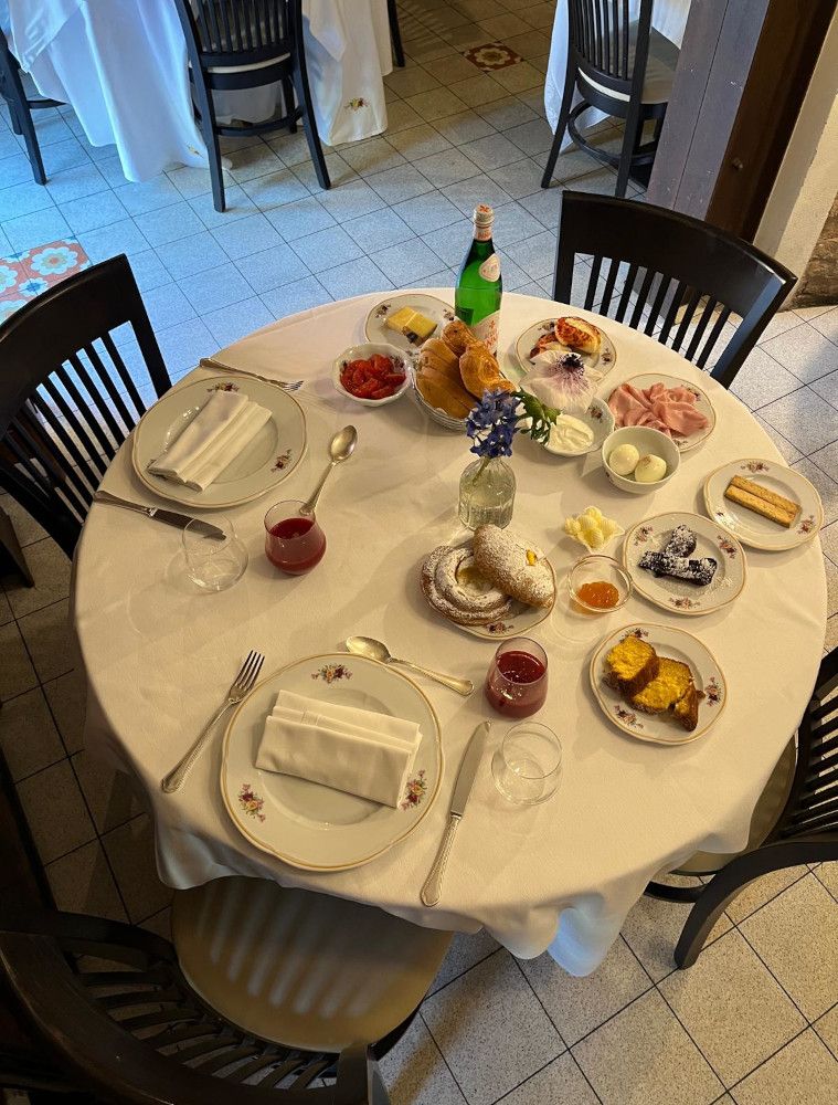 Torte e biscotti fatti in casa -anzi, in Osteria-, salumi e formaggi dallo Spaccio Aziendale, e poi, ancora, yogurt del Caseificio e confetture BIO, per un inizio di giornata al sapore d'Emilia.